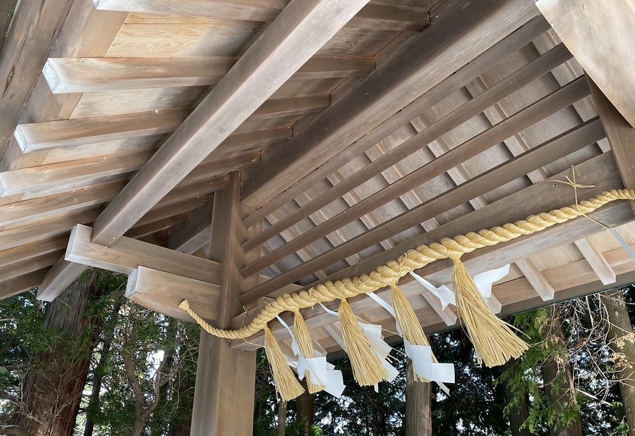 本殿の北西、参道に南面する切妻造平入銅板葺の手水舎。主柱を棟木まで延ばし、前後に低い控柱を立てて貫で固める。二段の腕木で軒桁を支え、主柱間に楣を入れ欄間は横連子。中央に自然石組の手水鉢を置く。簡明ながら存在感を示す手水舎で境内景観をつくる。