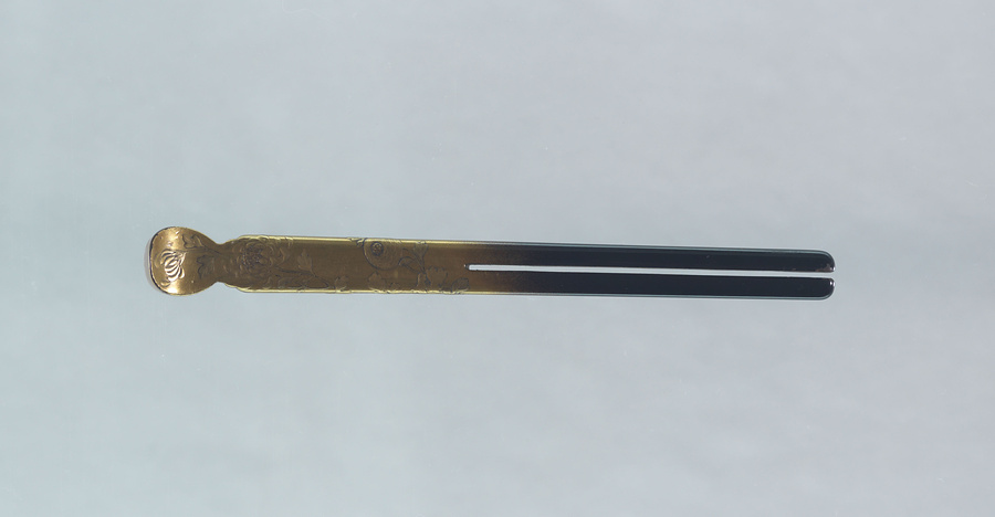 木製漆塗で、琴柱形、二本足の前差である。足先を黒漆で、胴から耳掻きまでを金粉溜地として間を蒔き暈し、高蒔絵で菊を表し、蕊には平目粉を蒔いている。簪は笄から分化して発生し、二本足の簪は享保以降に出現した。『玳瑁亀圖説』によると、鼈甲製の琴柱形前差は、江戸で寛政年間に流行したとされる。花柳章太郎(1894~1965)の旧蔵品で平成15年(2003)に遺族の青山久仁子氏より国立劇場へ寄贈された。