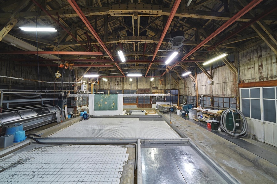 染色棟東隣に建つ、絨毯染色後の艶出加工及び洗濯を行う工場。木造平屋建、半切妻造鉄板葺で棟に三箇所の越屋根を設け、外壁に窓を並べる。西側の乾燥場と洗濯場は吹抜とし、陸梁中央を高めて繋ぐキングポスト・トラスを現す。敷地内に統一的な景観を形成。