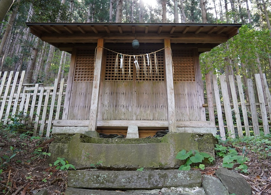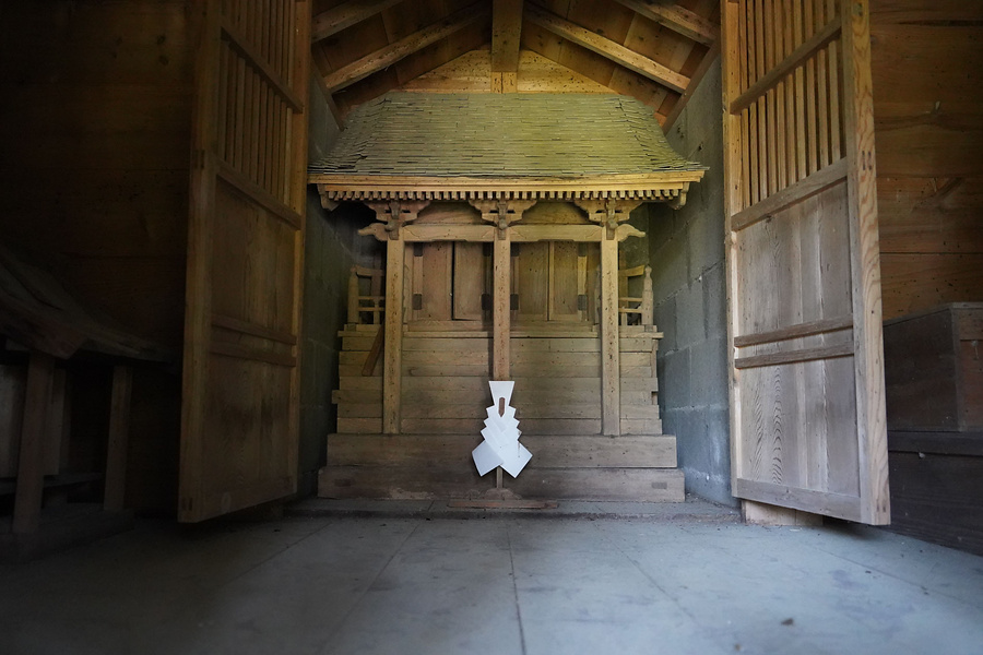 敷地東側の高台に西面して建つ小社。桁行3間梁間3間、木造平屋建切妻造鉄板葺で、背面にコンクリートブロック造両下造を突出する。内部は一室の板敷で突出部に二間社流造スレート葺の宮殿を安置する。全体に簡素なつくりながらも、敷地景観をつくる氏神社。