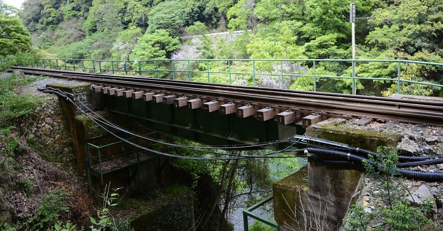 巌谷橋梁から約五〇〇メートル西南に位置する鉄道橋。保津川右支の渓流に架かる支間九・六メートル、単径間の単線上路式プレートガーダー橋。三〇フィートのいわゆるポーナル桁で上下フランジ、対傾構に補強を施し、戦前期の輸送力増強の歴史を伝える橋梁。