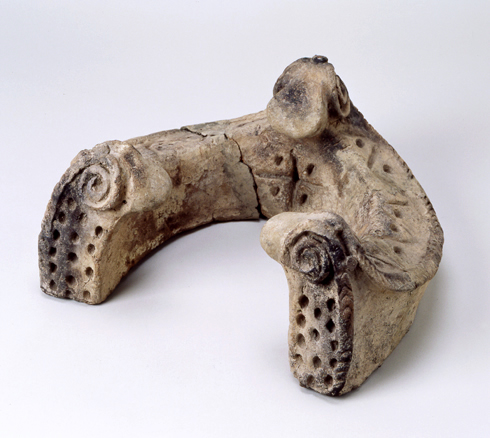三つの羊頭が向き合った形の五徳(ごとく)です。この上に鍋などをのせ、煮炊きに用います。煤が付着しており、実際に使用されたことが分かります。縁に刻みを入れ、十文字や列点の文様が彫り込まれています。