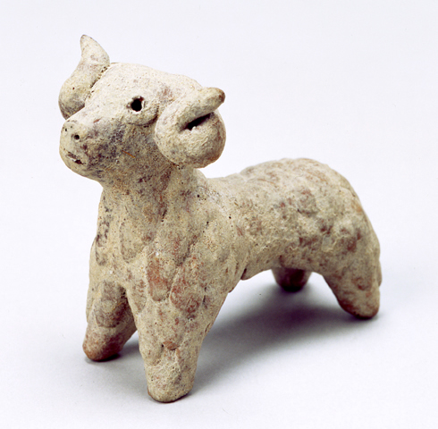 円い目、丸まった角、ふさふさした毛が立体的に表されています。粘土で作られた小動物像は新石器時代から知られていますが、この羊像は、立体的な毛の表現から青銅器時代のものではないかと思われます。