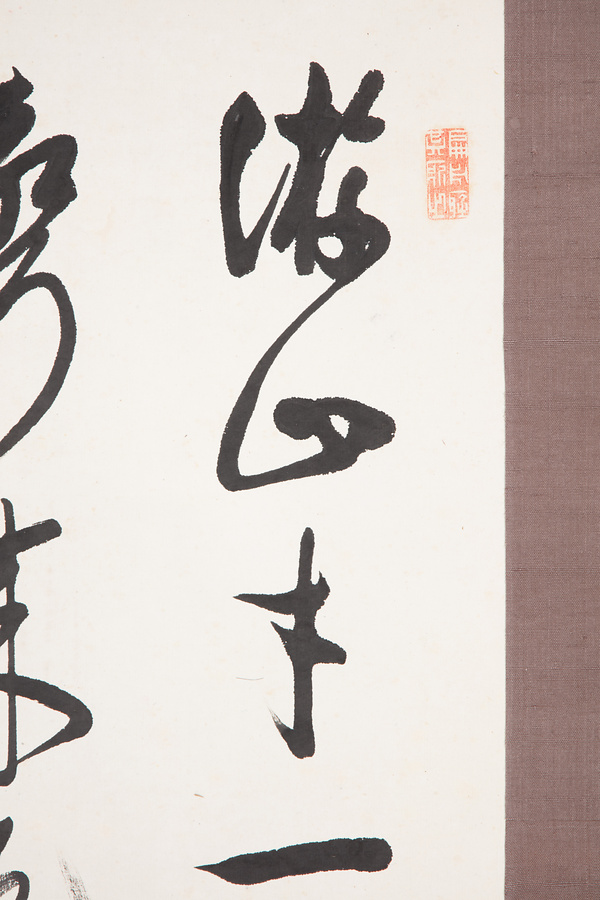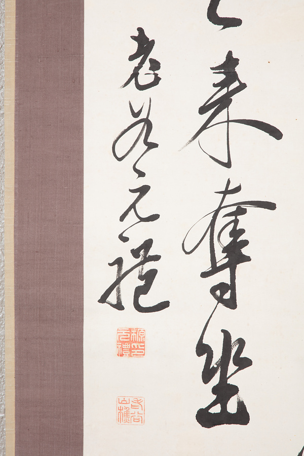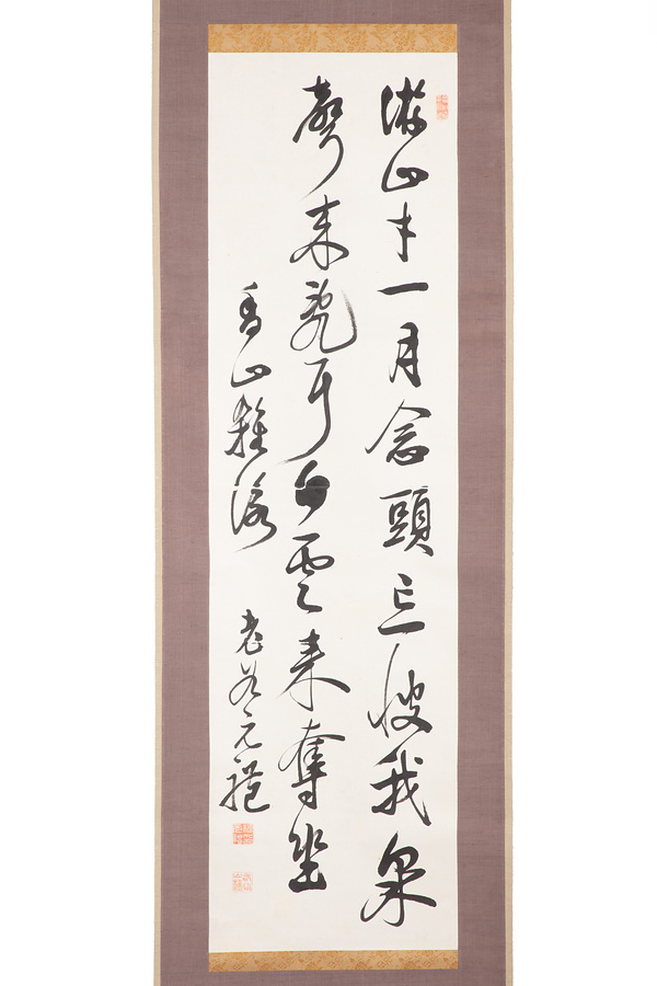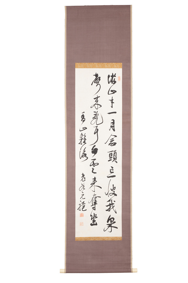 木原老谷は土浦藩士で、名を谷蔵、通称を雄吉、字を節夫、諱を元礼といい、老谷は号である。藩校郁文館の分館で藩士の教育にあたるなど、五十嵐愛山、中田平山と並び幕末の土浦藩を支えた人物のひとり。本作品は老谷が「游山寸一月 念頭忘彼我 泉声来乱耳 白雲来奪坐」の五言絶句をしたためたもの。