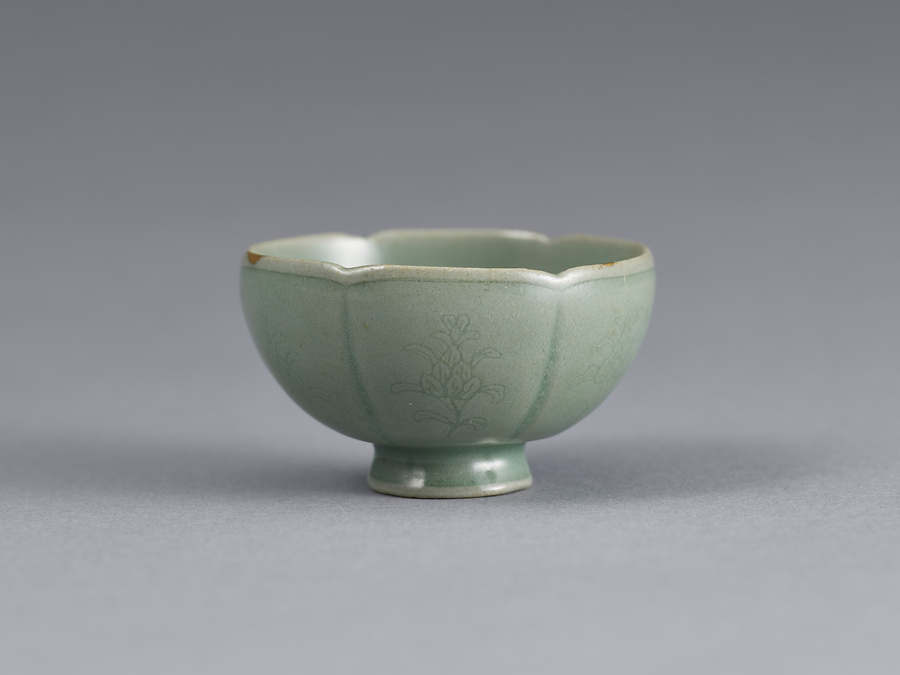 本作品は、坏・托ともに稜花形に作り、坏は外面には花文を、見込中央には菊花文を線彫りであらわし、托は中央部に托座を作り、座周りには葉形の連弁文を巡らし、座に美しい菊花文をあらわす。托座を囲むように溝に魚藻文を巡らしている。