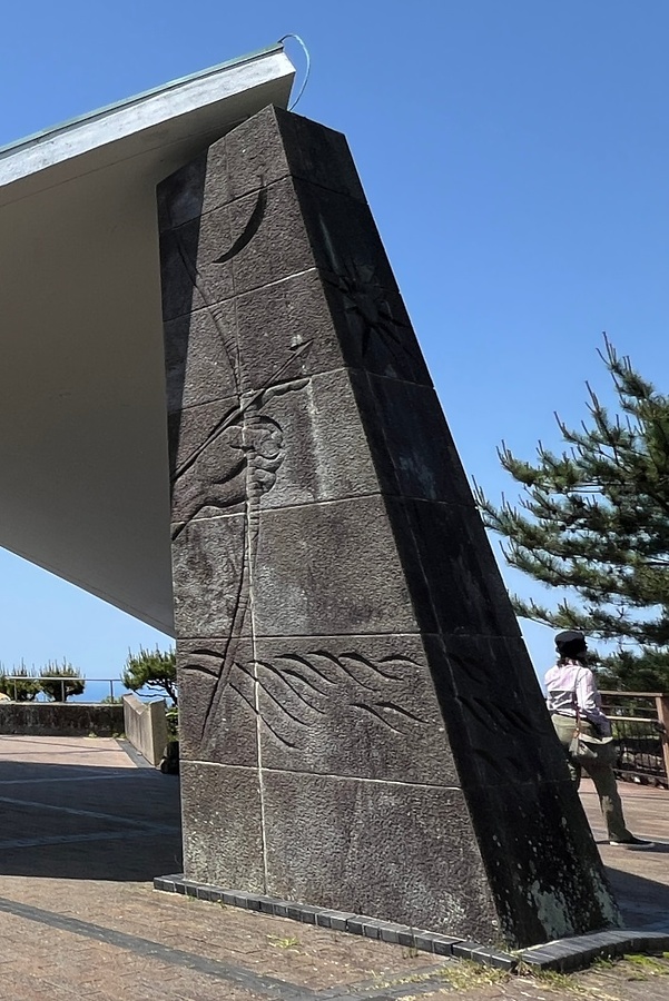 西海国立公園指定一〇周年を記念し、佐世保湾を望む丘に築いた展望所。前方二点と後方一点で支えた薄い反り屋根を鉄筋コンクリートHPシェル構造で実現。後方支柱は弓と波を象った本郷新のレリーフで飾る。自然景観にシャープな造形が際立つ坪井善勝の小品。