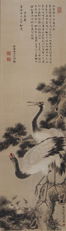 備中国(岡山県)鴨方の西山拙斎の書、岡山の画家黒田綾山の画による松鶴図。天明6(1786)に菅茶山の父、菅波樗平(すがなみちょへい)の還暦祝いとして贈られたものである。