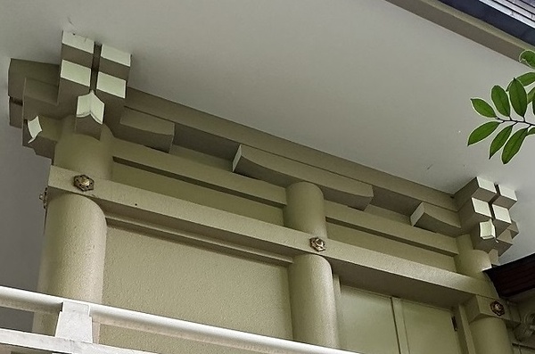 福岡城跡の南に位置する神社の本殿。設計は角南隆。境内東側に西面して建つ、鉄筋コンクリート造切妻造銅板葺で、周囲の庇を錣葺とする。軒裏は垂木形とせず平滑に仕上げて軽快にみせ、外に延ばす軒桁や梁、肘木の先端に竪溝を切るなど、独創的な意匠の本殿。