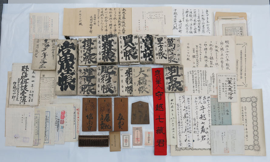 資料内訳は歴史資料(計77件95点)、民俗(交易)資料(計86件86点)。歴史資料には、「建物新築御届」などの守越家関係資料や各種授与状のほか、戦時下資料(赤襷「応召軍人守越七蔵君」、恩給証書)などがある。民俗(交易)資料には「肥料帳」・「売上帳」・「当座帳」などの商売関係の取引記録のほか、魚や塩、屎物などの商売鑑札などもある。