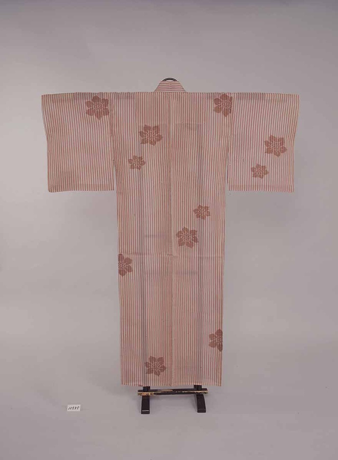 白地に臙脂・青の縞に茶の花飛び柄紋縫取表土場 渡辺一勇氏製作