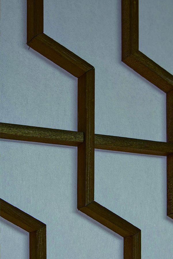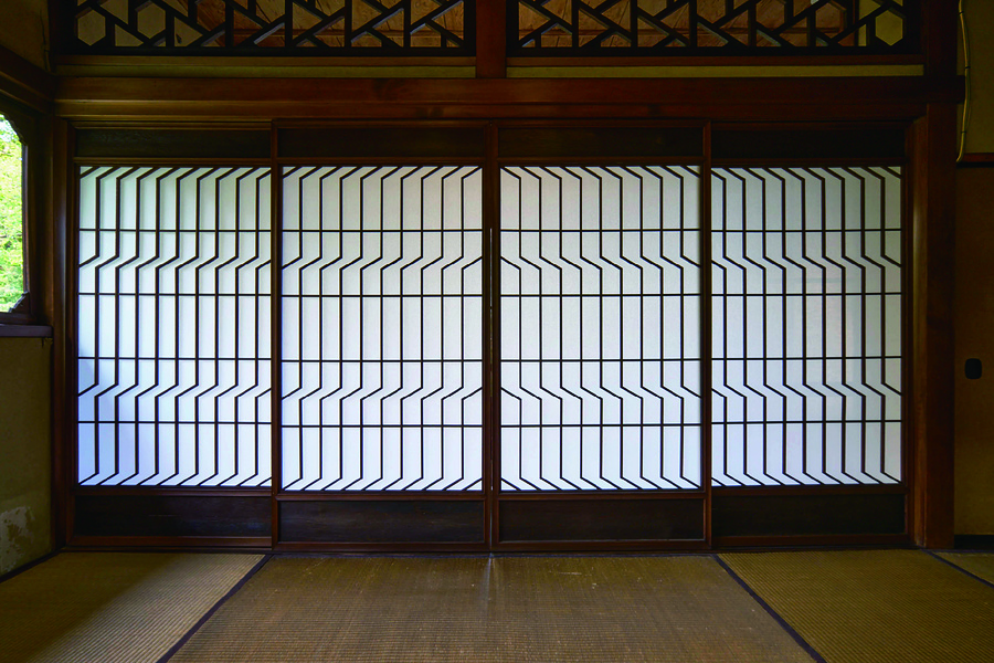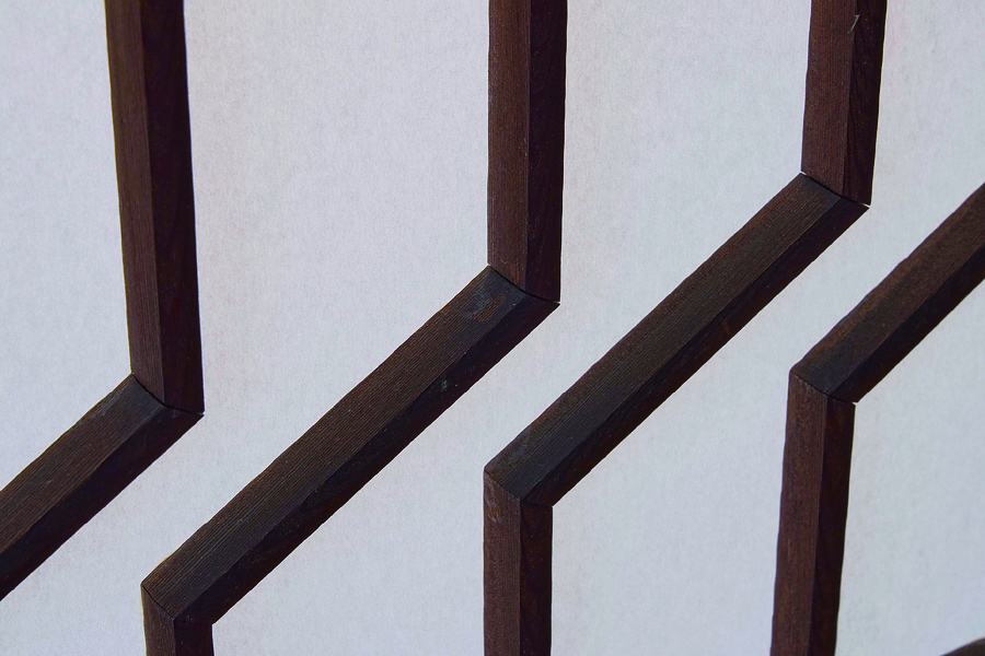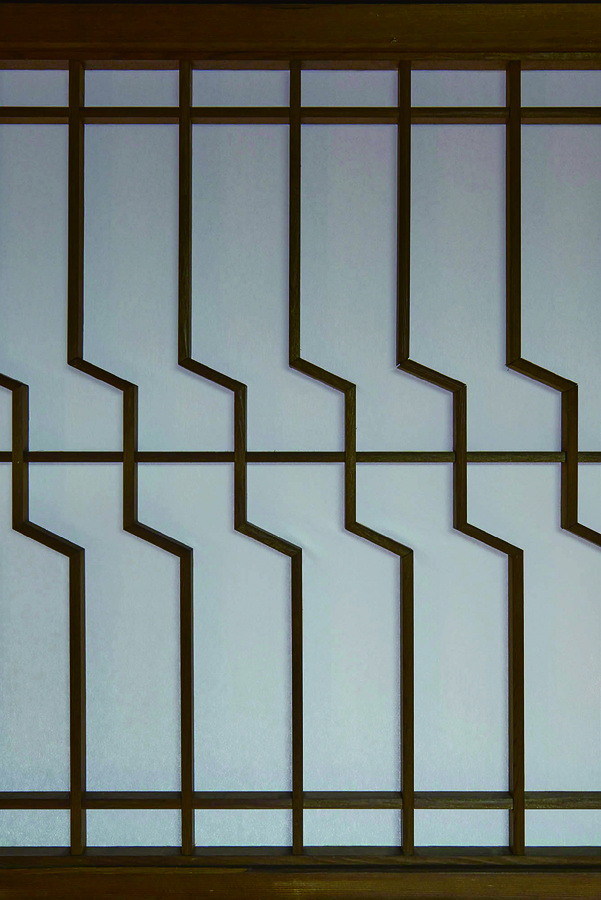 三階応接室を仕切る襖に用いられた組子意匠。中国・明代の造園書『園冶』(別名『奪天工』)に掲載される「人字變式」の図を応用したものとみられる。襖の框部分は中央が船底状に削られており、意匠性を備えると同時に、手掛かりとしての機能も兼ねている。
