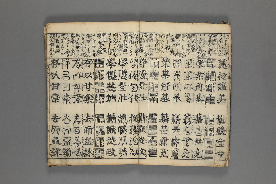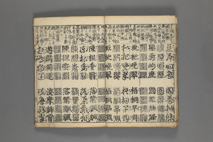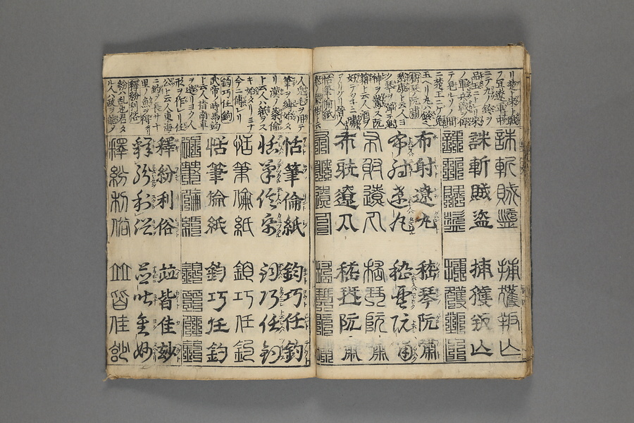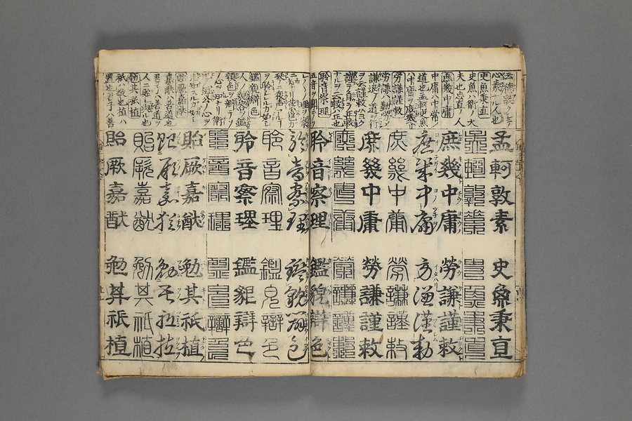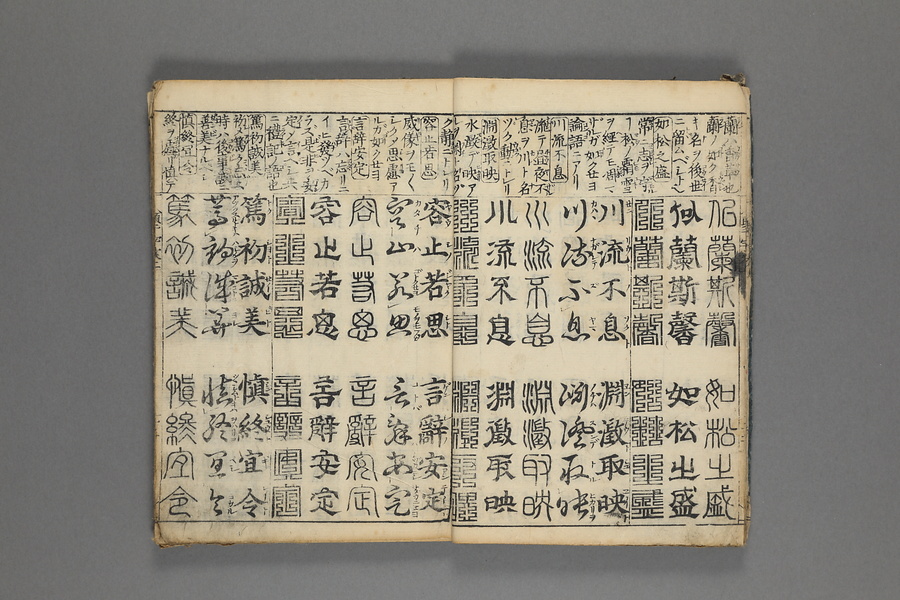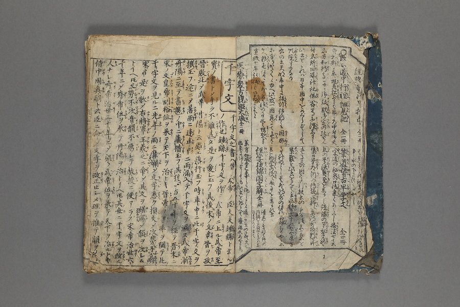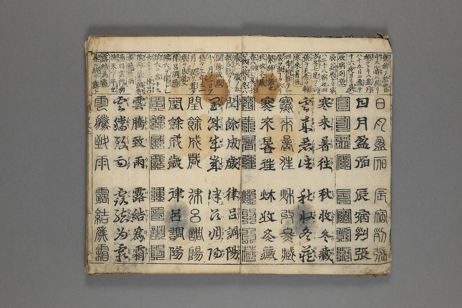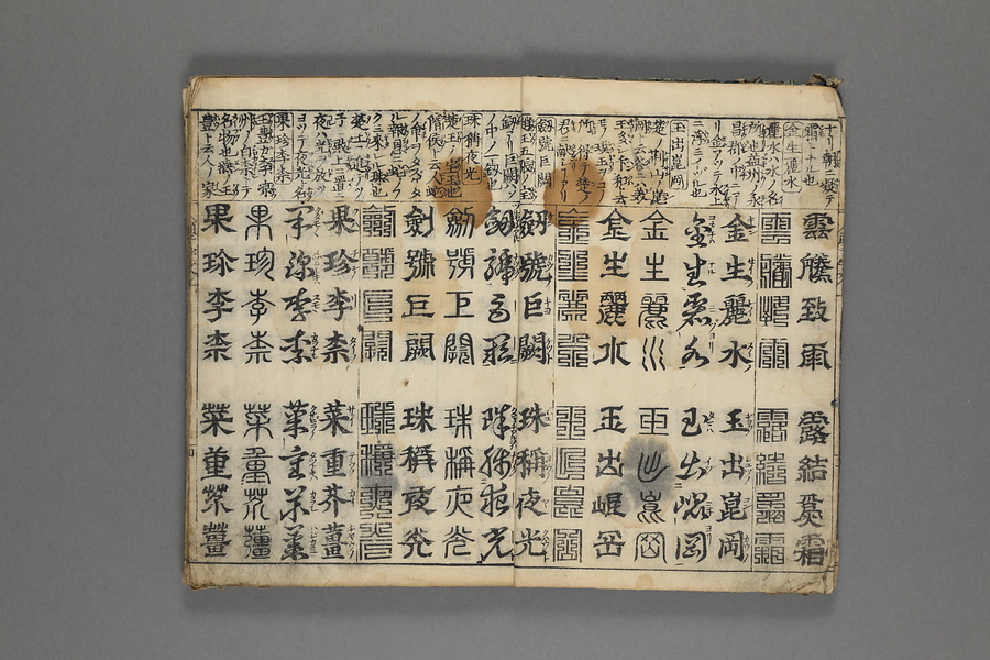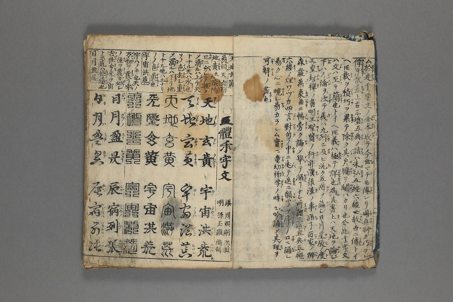 貞享5年(1688)刊。漢字習得の教科書として広く使われた南朝・梁の周興嗣撰『千字文』に見える計1000字からなる文章を、楷書・行書・草書・隷書・篆書5種類の書体で併記した書物。江戸時代の寺子屋で漢字学習や書道の教材として広く用いられた。