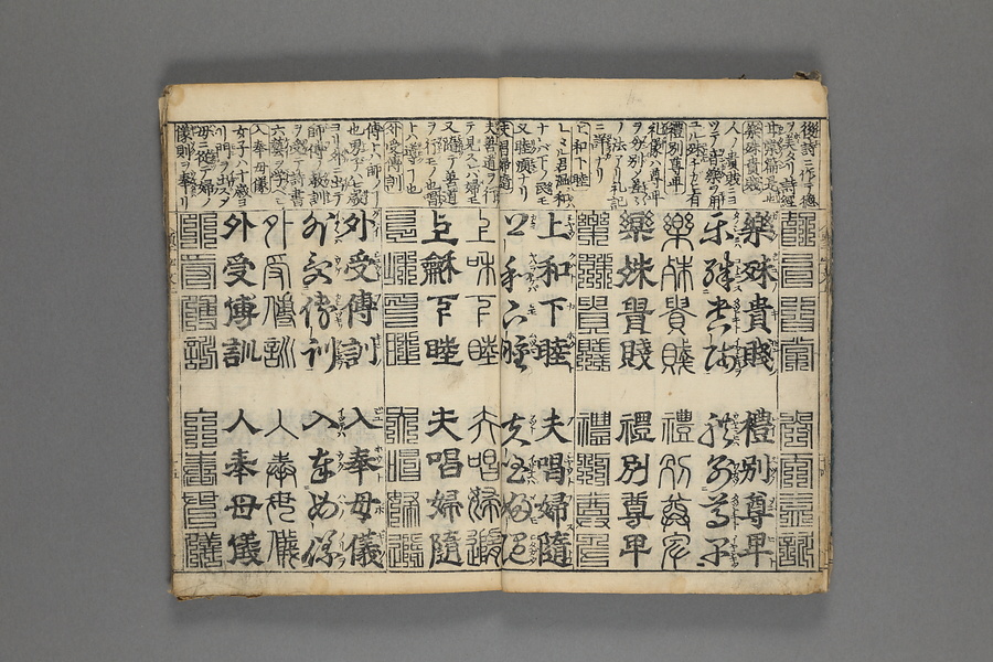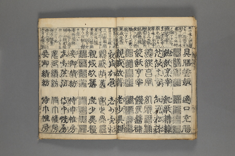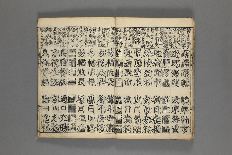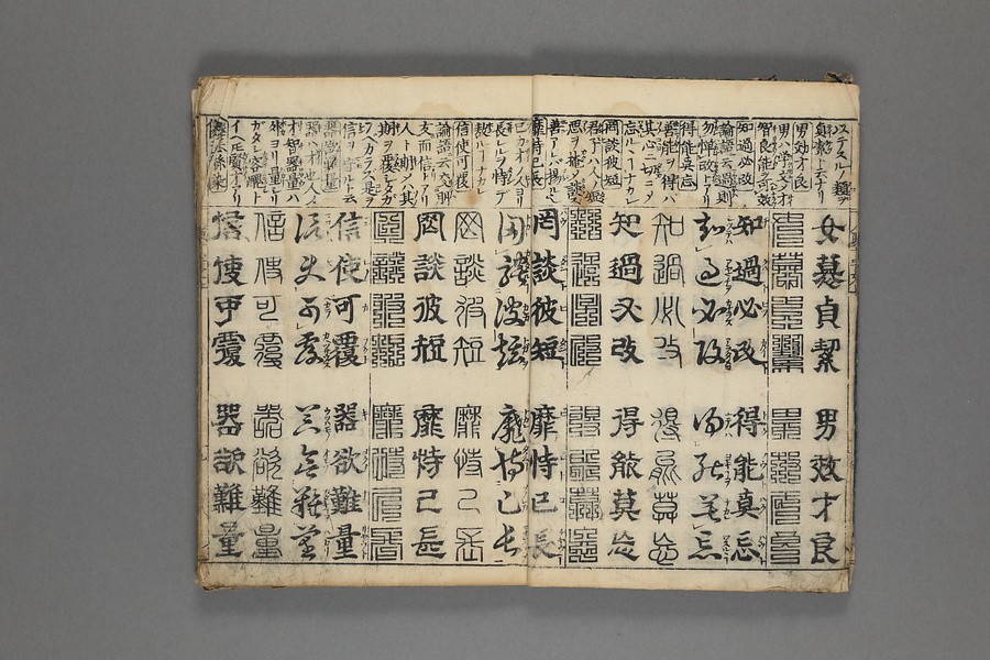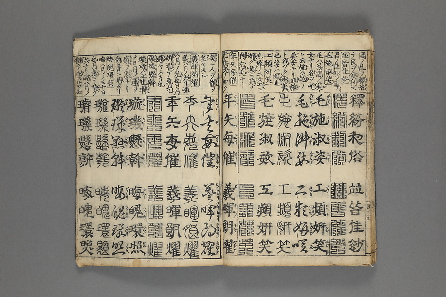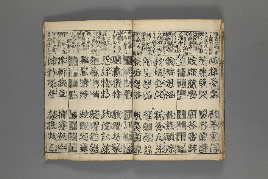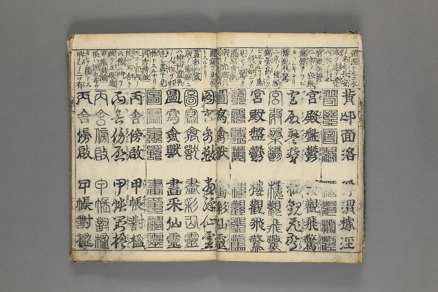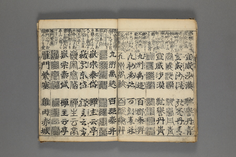 貞享5年(1688)刊。漢字習得の教科書として広く使われた南朝・梁の周興嗣撰『千字文』に見える計1000字からなる文章を、楷書・行書・草書・隷書・篆書5種類の書体で併記した書物。江戸時代の寺子屋で漢字学習や書道の教材として広く用いられた。