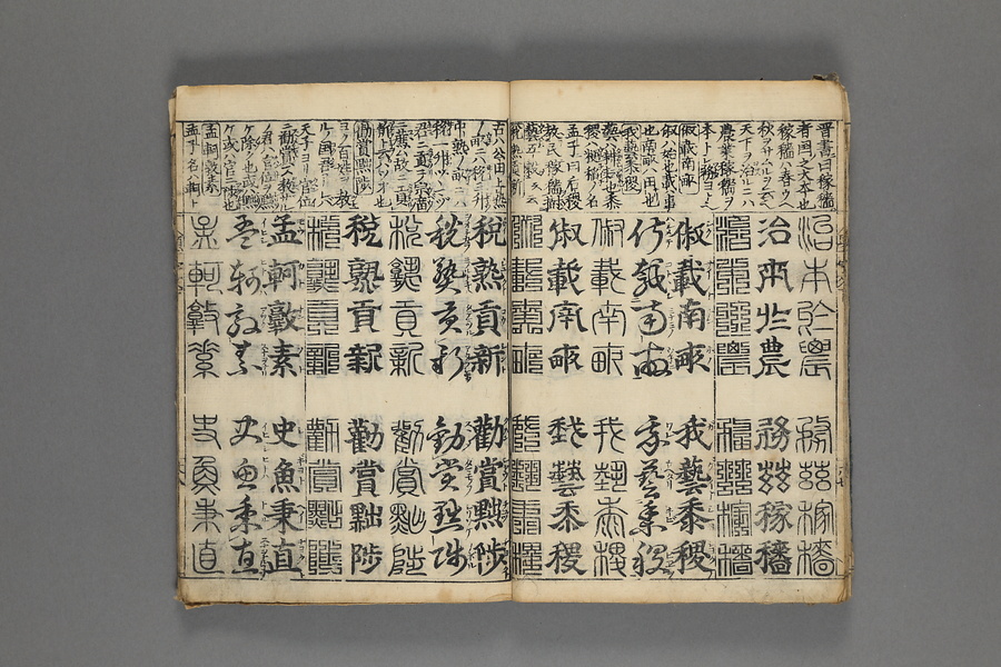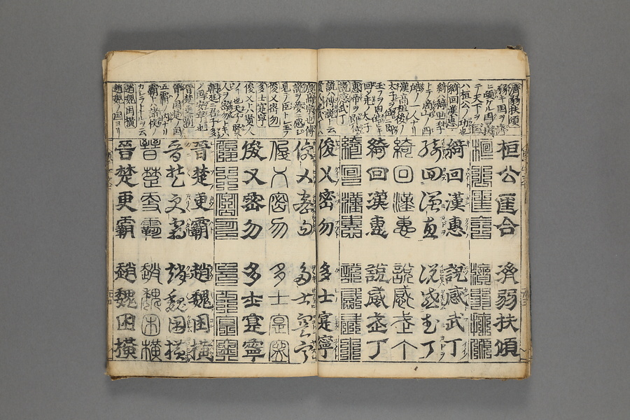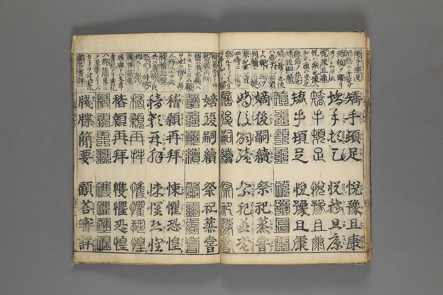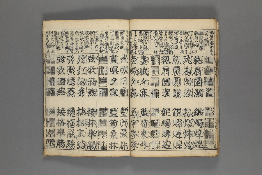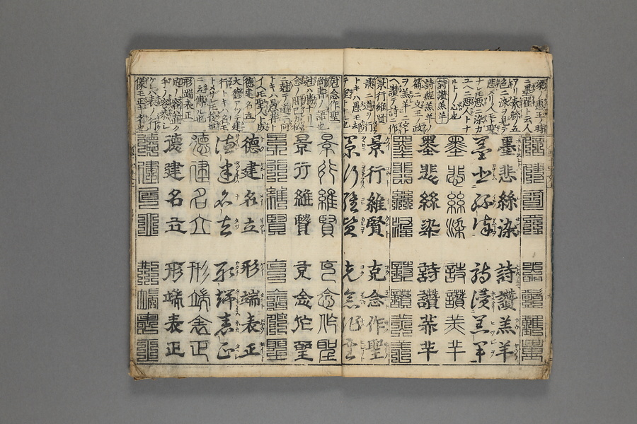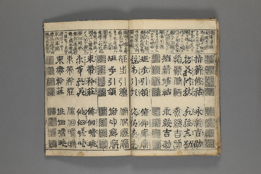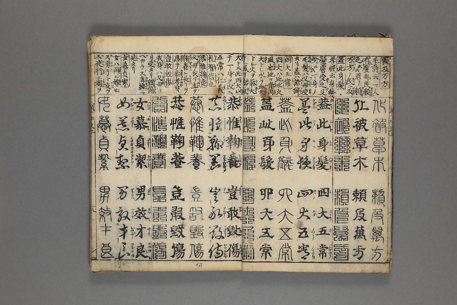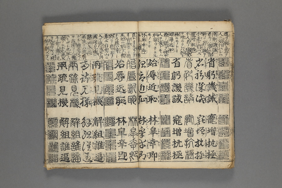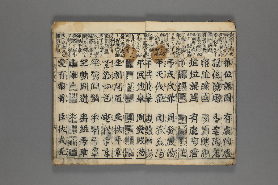貞享5年(1688)刊。漢字習得の教科書として広く使われた南朝・梁の周興嗣撰『千字文』に見える計1000字からなる文章を、楷書・行書・草書・隷書・篆書5種類の書体で併記した書物。江戸時代の寺子屋で漢字学習や書道の教材として広く用いられた。