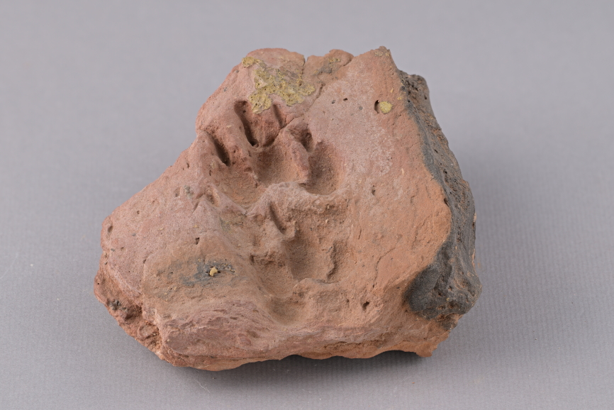 ハラッパーは、紀元前2300~1700年頃インダス川中流にあった都市遺跡で、れんが造りの建物と、大小の道路によって碁盤目状に区切られている整然とした街並みが特徴である。都市は城塞部分と市街地で構成され、城塞の外側には穀物倉などが置かれている。日干しれんがと併用して焼成れんがが多用されている。このれんがハラッパ―遺跡から出土したもので、表面にはれんがを日干ししていた際の小動物の足跡がついている。