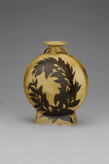 黄瀬戸釉掻落草花文扁壺