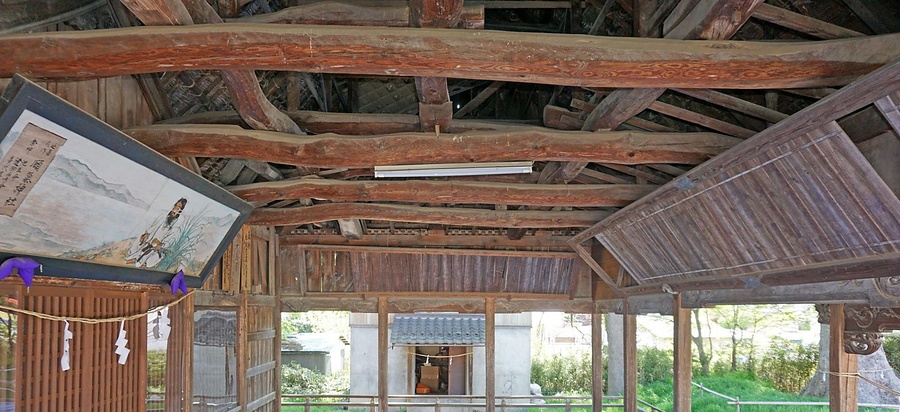 本殿の前方に建つ拝殿及び祝詞殿。横長で大型の向拝付拝殿の背面に祝詞殿を突出し、拝殿は入母屋造茅葺(鉄板仮葺)で祝詞殿は切妻造鉄板葺。拝殿は三方を吹放つ板敷の一室で天井張らず小屋組を現し、祝詞殿は棹縁天井を張る。当社の歴史を伝える中心的社殿。