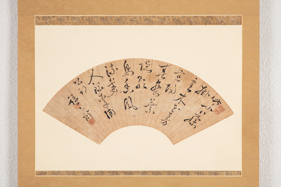 大久保要は土浦藩士で、通称は要、靖斎は号である。土屋彦直・寅直時代を支え、幕末には公用人を務めた。本作品は「紫藤掛雲木 花蔓宣陽春 密陽隠歌鳥 香風流美人 録李酒公詩」と、李白が「紫藤樹」と題した五言絶句を扇面にしたためたものである。