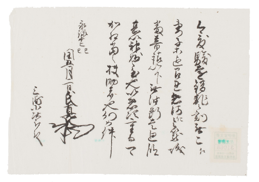 江戸時代後期に彦根藩士三浦銀右衛門家から藩に提出された同家伝来文書の写。「駿遠錯乱」の刻に懸河に籠城し番普請以下を走廻した段は神妙の至りであり、相当の扶助を加える旨を記しています。