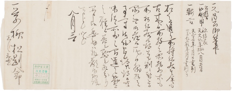 筆・筋甲・鞍等についての届書。彦根藩士松居剛八郎が同藩士日下部一学に提出したものです。久昌公(井伊直孝)の御筆や筋甲、その他古来より所持しているものがあること、脇差については一寸間違いもあったため、委細は拝顔の際に話したいと記されています。