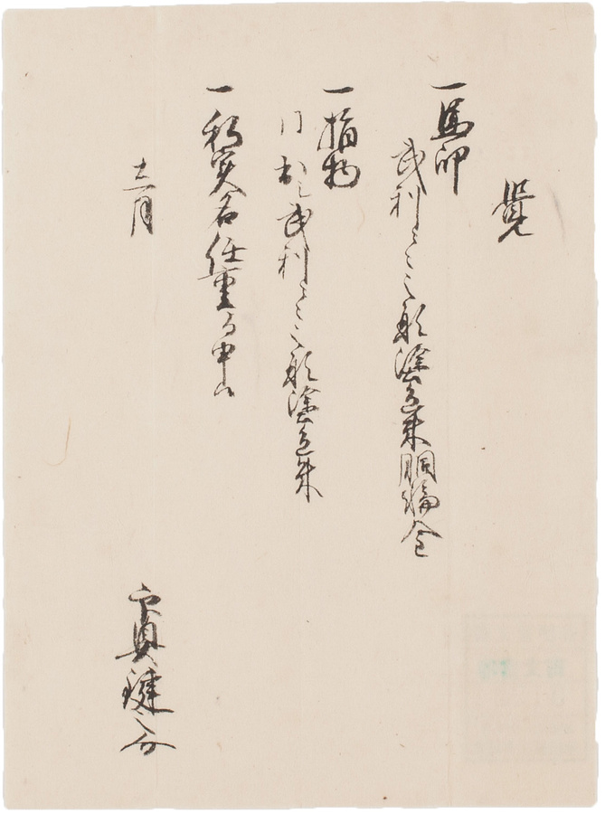 馬印・指物。実名についての届書。彦根藩士印具徳右衛門家9代目任重から提出されたものです。印具は所持していること、実名は任重であるであることが記されています。
