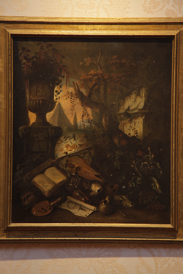 ヴァニタスとはラテン語で「空虚」という意味の静物画の一ジャンルです。17世紀黄金時代のオランダで誕生した絵画様式で、一見すると暗い色彩で描かれた細密な静物画のようですが、その随所には骸骨や熟れた果物、枯れかけの植物や時計などが描かれ、「生の儚さ」や「死の確実さ」を示しています。本作についてもありふれた静物画に見えますが、画面内に散りばめられたモチーフから、ヴァニタスとして描かれたことが分かります。