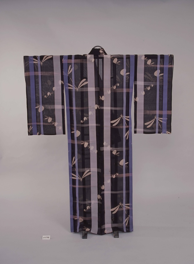 抜染加工、黒地に白・薄青・青の縞に桃・白の霞緯段に薄茶のトンボ・蝶模様染