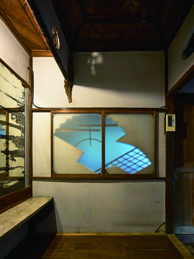 風呂場前の脱衣室には、建具に意匠的な工夫が凝らされている。天井は寄木細工となっており、擦りガラスの窓が付けられた風呂場との仕切り壁には扇紙形の窓枠が配されている。中野氏が所有していた大正15年(1926)に設けられたとされる。
