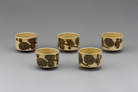 黄瀬戸釉掻落草花文筒形茶碗