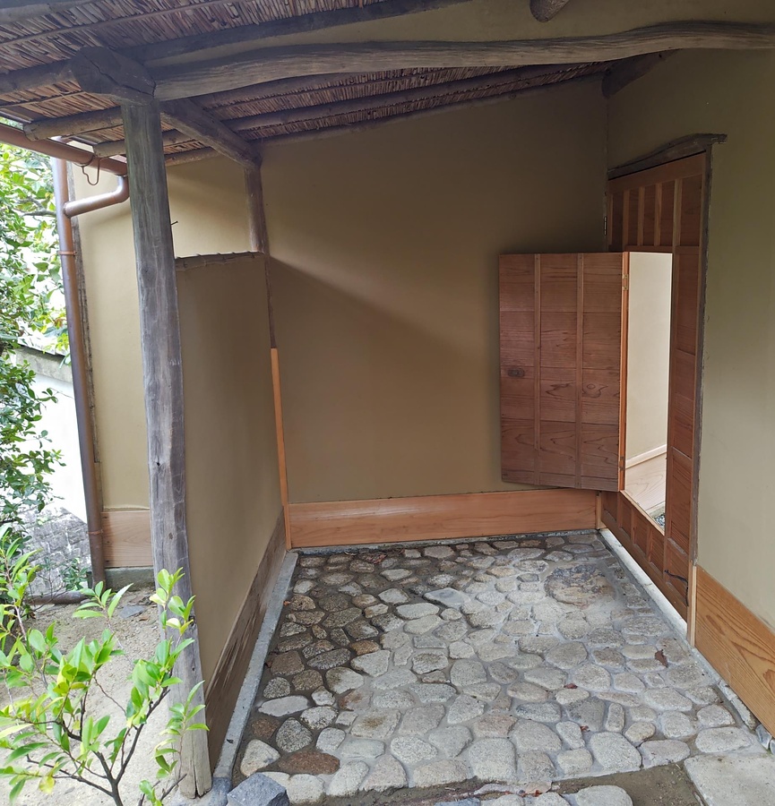 正門と外腰掛待合の間に位置し、露地への入口に建つ門。屋根は目板瓦葺とし、門口に潜戸付板戸を開け、銅板葺の庇を付す。背面は銅板葺の下屋を葺き降ろし、内部は石敷の土間とする。塀に下屋を付した特徴的な平面で、表千家の露地門に通じる形式とした門。