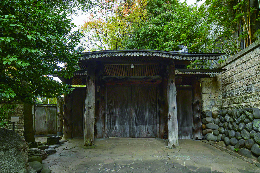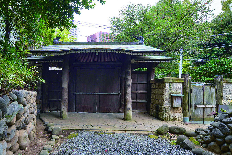 銅御殿の表門で、通称「大門」とよばれる。屋敷地の北西隅に位置し、南北方向に建つ。京都・大徳寺龍光院の兜門を参考に造られたと伝えられる。太い本柱二本に、袖柱四本を組み合わせた四脚門で、屋根は銅板葺である。大門は、主屋の完成後、趣向を凝らして約一年をかけて建てられ、大正2年(1913)に竣工した。主屋とは別に、国の重要文化財に指定されている。