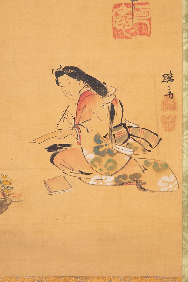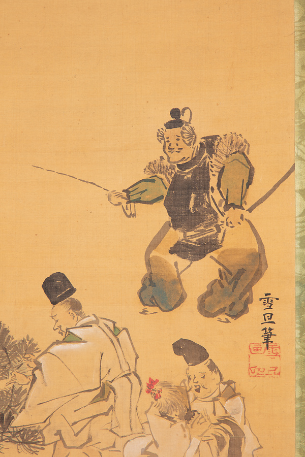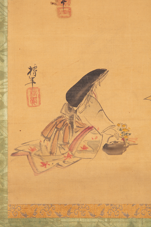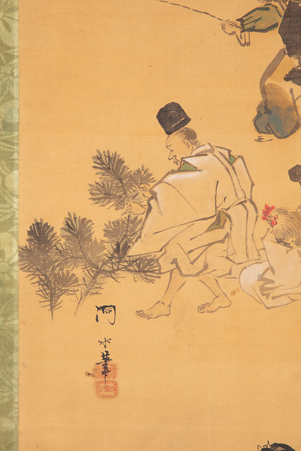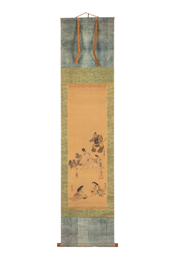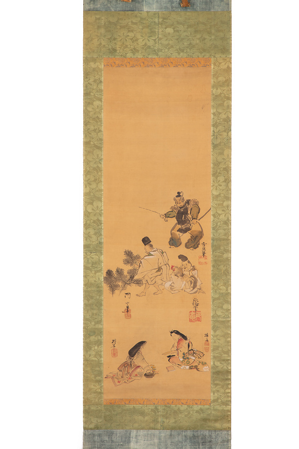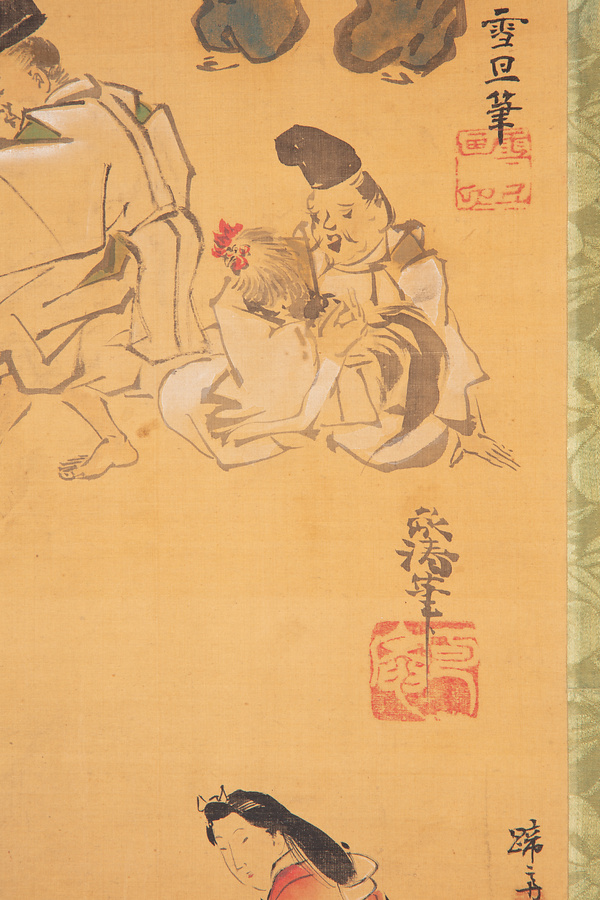 岡部洞水は、土浦藩土屋家に絵師として仕えた。岡部洞水・長谷川雪旦・蹄斎北馬・大西椿山・喜多武清ら江戸在住の5名の絵師が、五節句の図柄をひとつずつ描いて一作品としたもの。合作は席画とも呼ばれ、詩家や料亭などでの飲食に同席した人々が興に任せて筆をとったり、書画会で客の眼前で描いたりするもので、本作品もそうした機会に描かれたものと考えられたものであろう。絵師たちの交友関係を知る手がかりとなる作品である。