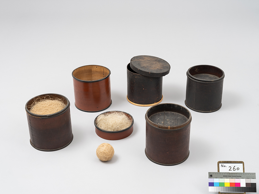 画像中央下の玉は麻(カラソ)。画像左と中央の苧が入っているフタ部分はカケゴという。