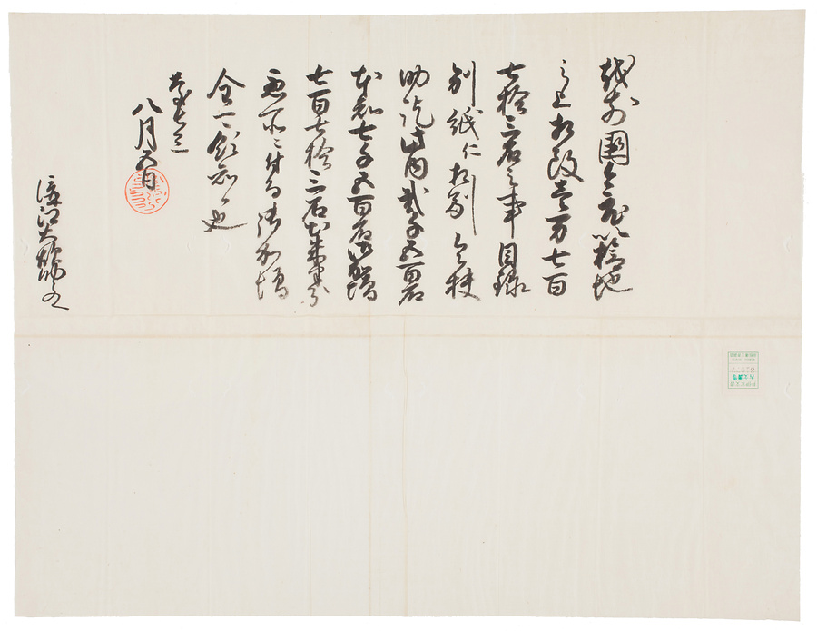 江戸時代後期に彦根藩士溝江彦之右衛門家から藩に提出された同家伝来文書の写。豊臣秀吉が溝江大炊助に、越前国一万七百七十三石の領知を宛がっています。