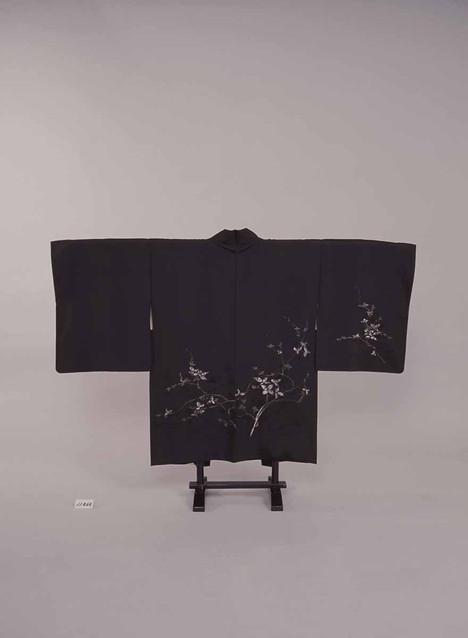 黒地(野に枝葉地紋/朱子表現の紋綸子)に白の枝花手描