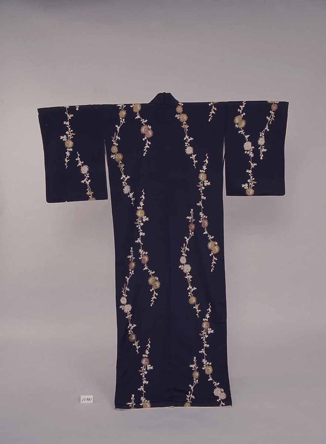 濃紫地に白・桃・金の茎葉付小菊縫取