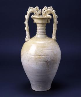 卵形の胴に長い頸、左右に長い把手(耳)を持つ形は、古代ギリシアのアンフォラという壺を思わせ、西方から伝えられた形状と考えられています。西方的な器形がそのまま模倣されるのではなく、中国で伝統的に好まれていた龍のデザインが組み合わされています。ユーラシア大陸の幅広い交流がうかがわれると同時に、美しいフォルムに唐代の美意識も感じられます。