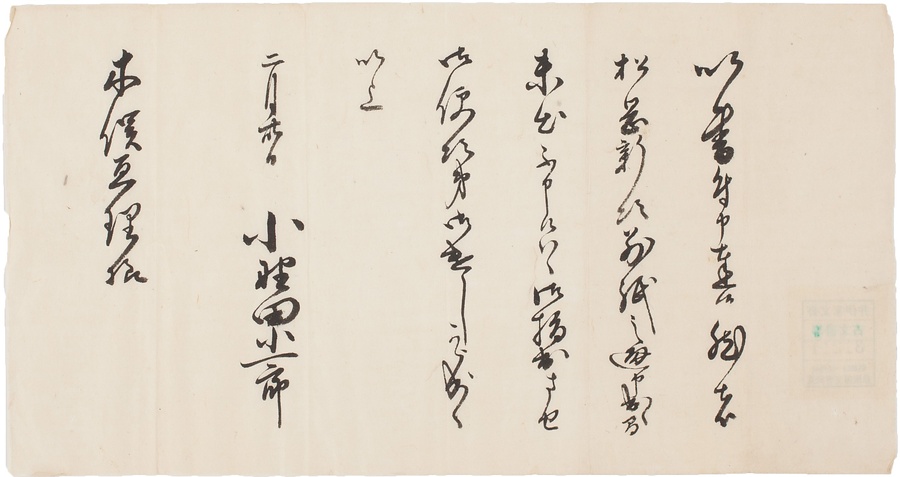彦根藩士小野田小一郎が同藩士木俣亘理に宛てた用状。松岡新次に別紙の通りに申し出たので、まだ出していないようであれば、松岡に指し出させ、お便り次第にお遣わし下さいと述べています。