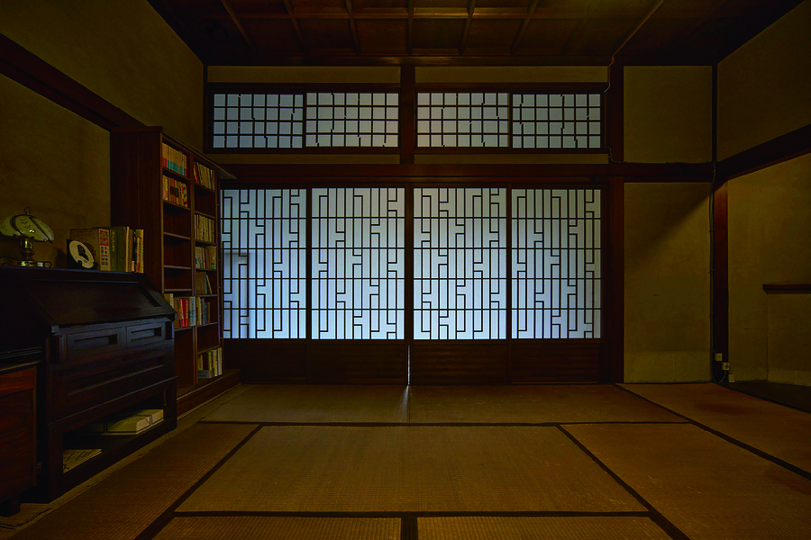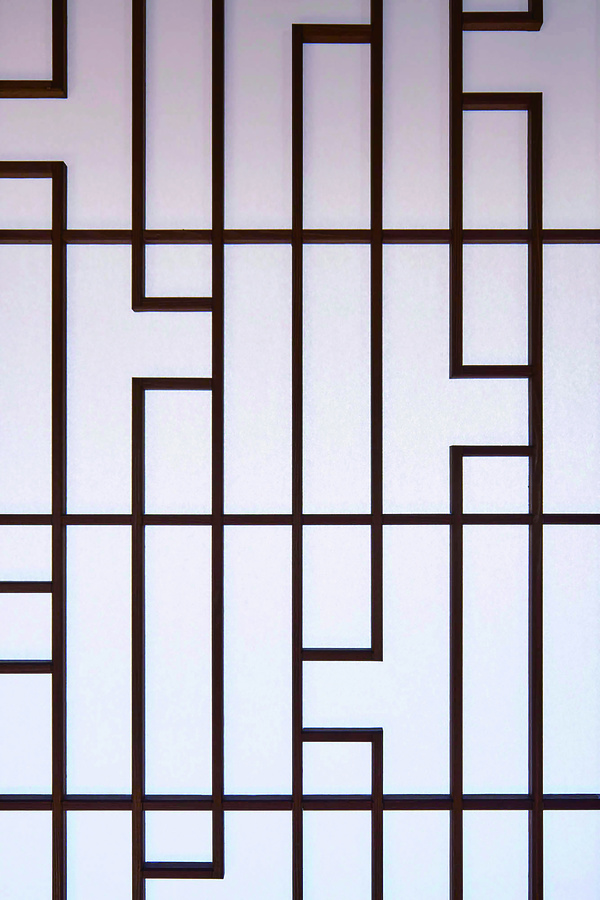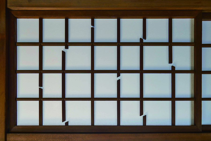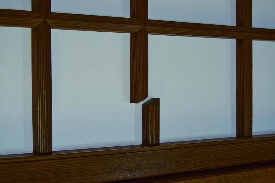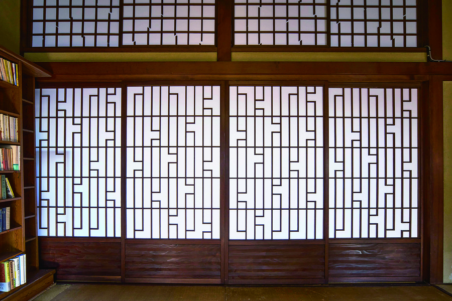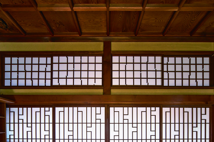組子の装飾が施された二階応接室の障子。下の障子は中国・明代の造園書『園冶』(別名『奪天工』)の「井字變体花式」の図式を参考としたとみられ、上の欄間障子の組子は格子文様を基調とするが、線を断続させた変形意匠としている。