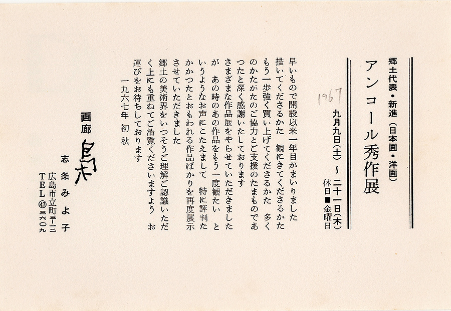 画廊「梟」で行われた、「郷土代表・新進(日本画・洋画)アンコール秀作展」(1967.9.9-21)の案内状