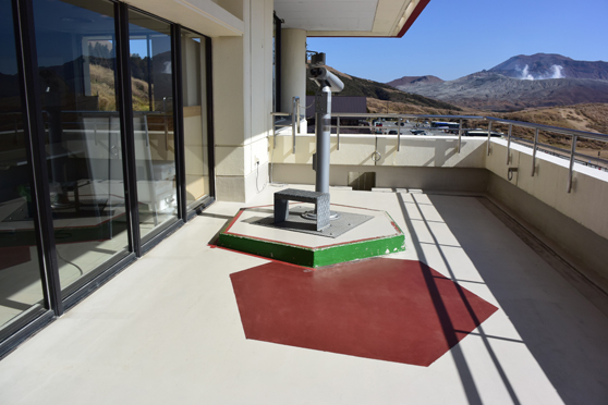 当館3階のベランダには当時の被害の大きさを残すため、双眼鏡(およそ1トン)がもともとあった場所を赤くペイントしています。