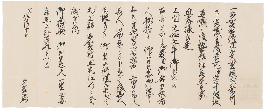彦根藩士多賀谷儀右衛門が同藩士木俣亘理に宛てた用状。馬印について、白絹に墨で猪の形がある馬印のみが伝来していることなどが記されています。