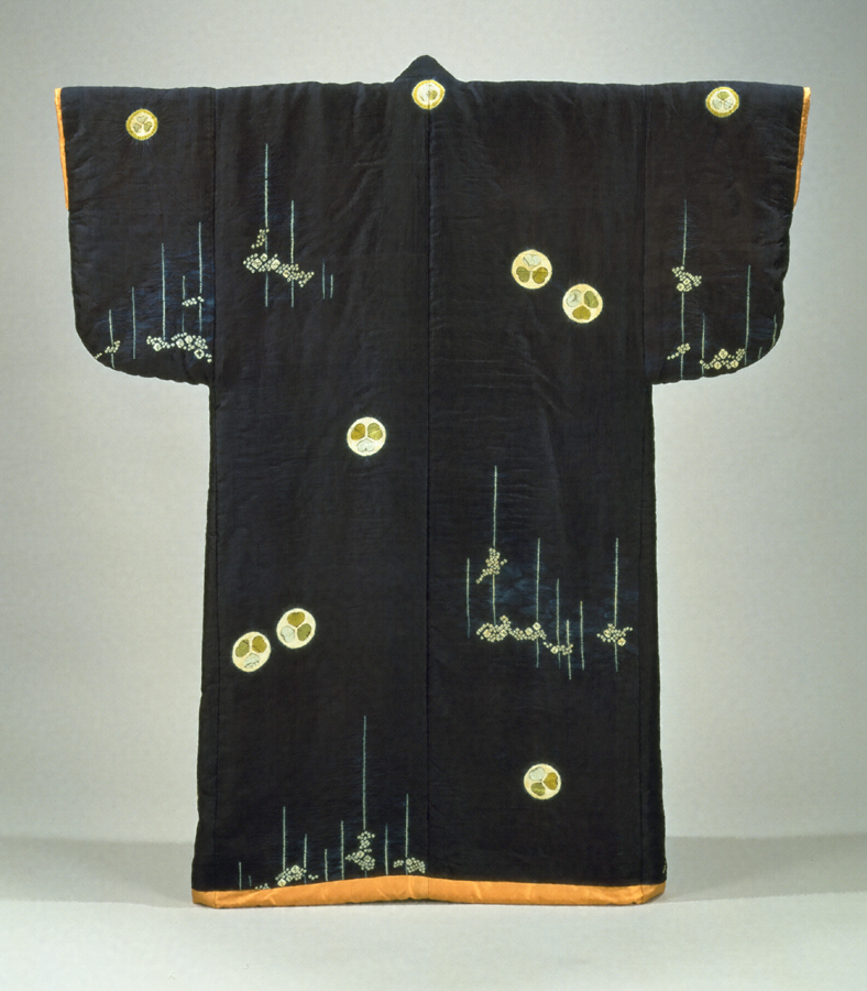 縫い絞りによる文様染を中心に描き絵を加えた「辻ヶ花」は、十五世紀の終り頃に誕生したと言われ、十六世紀後半には最盛期を迎え、豊かで華麗な様式を生み出し、武家の着衣としてもてはやされた。十六世紀末から十七世紀初にかけて「辻ヶ花」は最終段階に入り、おおらかさから瀟洒な文様へと江戸時代初の小袖に連なる過渡的要素を示すようになる。慶長期(一五九六-一六一五)以降の「辻ヶ花」作品群のうち、小袖・羽織など当初の形態のまま現存している作品のほとんどが徳川家康が関与した品である。徳川美術館には、現在、家康の「辻ヶ花」の衣服が七領、また十二領分の残缺を貼り込んだ帖が保存されている。この小袖は、従来の「辻ヶ花」の特徴からはやや脱した作品で、紺の練貫地に葵紋と槍梅文を右上がりの斜線状の配置とし、槍梅の鋭く真上に伸びる直線とが相まって躍動感溢れた意匠を生み出している。