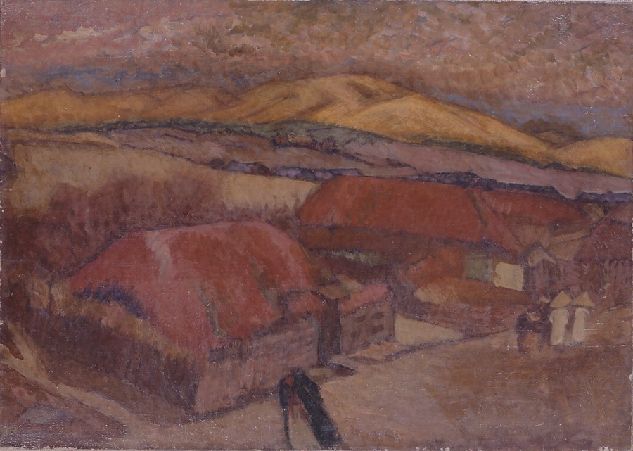 遠ざかりゆくひろがりは、手前の道、家並み、丘、遠山など、横にのびる帯を重ねることによって表されている。暖かい褐色を基調にしつつ、各帯はおおむね単純化されたひとつの色の面をなす。ただしこの色面は、決して平板になることなく、大地の起伏をよく表現しえていよう。