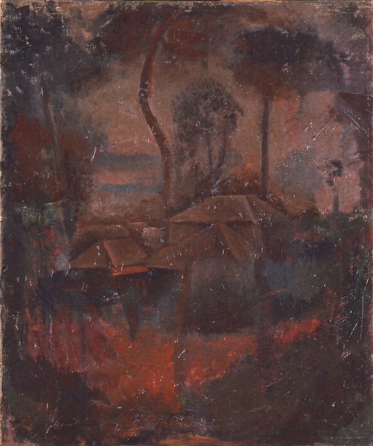 萬が一時土沢に帰郷したのは1914、5年。こうした木の間風景を他にも数点描いたのは18年頃である。恐らくその間に、彼の内部で現実の土沢の風景は次第に変容していったにちがいない。それぞれ全く独自の性格を示し、現実とは異なる絵画独自の秩序の探求という姿勢を強く感じさせる他の作品と比べると、この作品はまだ現実の農村を彷彿とさせる。ちょうど現実の風景が彼の内部で変容を始める入口に位置しているのかもしれない。
