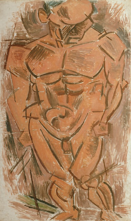 筋骨たくましい男の裸体像は、萬鐵五郎が生涯温め続けたモチーフの一つである。作品の原型像は大正3年に描かれ、この「男」というモチーフは早くから彼の中に芽生えていたものであった。本作品の生成には次のような経緯がある。萬は《もたれて立つ人》(東京国立近代美術館蔵)に続くキュビスムの大作として、大正9年にこの作品に着手したが、彼の言葉によると「その時自分の手練に或る欠かんがあり、且つ体力にも充実を欠いて居たので」一旦制作を放棄した。ところが14年になって「今度或る充実を感じて来た」ので一気に仕上げたという。一つの主題と向かい合い、固有の造形に昇華させようとする画家の姿が浮かんでくる。全体を支配するリズミカルな筆のストロークは男の肉体の呼吸するリズムであり、同時に萬自身の肉体と精神の統一されたリズムを表す。キュビスムの造形言語と南画の精神に裏付けられた萬独自の肉体表現が結びつき、ここに未開の堂々たるモニュメントが現出した。
