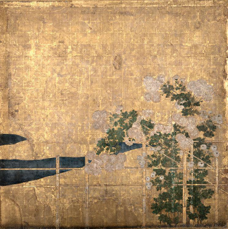 本図は隣接する帳台の間と壁で遮断されるため、長押上の上下とも壁貼付となる。菊花図は、画面左方から中央にかけて流水、右方は竹垣と菊花が描かれるが、垣根や花ともに右へいくほど数多くなり、右端ではほぼ画面いっぱいに紅白の菊花が咲き誇っている。扇面諸図は、左より、花筏図、秋草図、菊に水仙図、土坡に紅葉図、紅白躑躅図、牡丹に胡蝶図、菊花図、柴垣に松図、桃花図、山吹図の計十面である。左から二番目の花筏図のみ下向きに描かれ変化を示している。