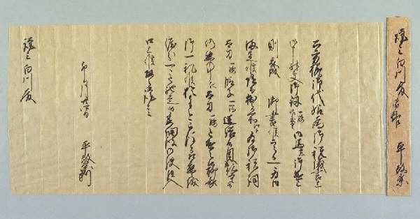 「平政景」(梶原政景)から「白川殿」への書状。「公方様」(鎌倉公方カ)の代始めにあたって、「白川殿」が「釼<つるぎ>」と黒毛の「馬」を献上したことに対する御礼などが記されている。日付は「卯月廿四日」(四月二十四日)。形態は切紙。