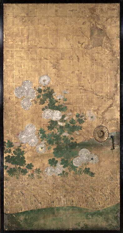 菊花図は、画面左方に土坡を背景として大小の垣根と白菊、紅菊を配し、中央部には流水を大きく描く。この部分では花の割合は少なくなっており、花自体も小ぶりである。右方には、柴垣に紅白の菊が配されている。右部分の花が柴垣とともに右からの風になびいているなど、全体に変化にとむ構成となる。扇面諸図は、左より、菊薄図(泥絵)、薄に萩図、桃図、波涛図、枯木に宿鳥図(墨画)、桔梗に薄図、雷文図、山水図(墨画)、墨竹図、楼閣山水図(墨画)、柴垣に蔦図、木瓜に小禽図、楼閣山水図(墨画)を描く計十三面である。