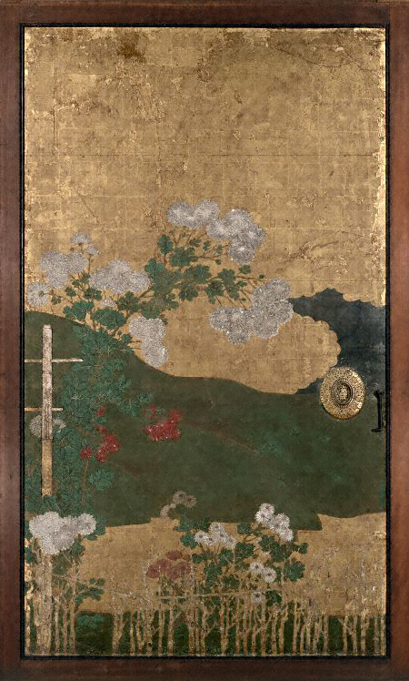 菊花図は、画面左方に土坡を背景として大小の垣根と白菊、紅菊を配し、中央部には流水を大きく描く。この部分では花の割合は少なくなっており、花自体も小ぶりである。右方には、柴垣に紅白の菊が配されている。右部分の花が柴垣とともに右からの風になびいているなど、全体に変化にとむ構成となる。扇面諸図は、左より、菊薄図(泥絵)、薄に萩図、桃図、波涛図、枯木に宿鳥図(墨画)、桔梗に薄図、雷文図、山水図(墨画)、墨竹図、楼閣山水図(墨画)、柴垣に蔦図、木瓜に小禽図、楼閣山水図(墨画)を描く計十三面である。